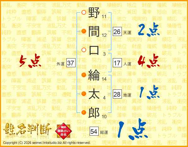 野(11画)間(12画)口(3画) 綸(14画)太(4画)郎(10画)