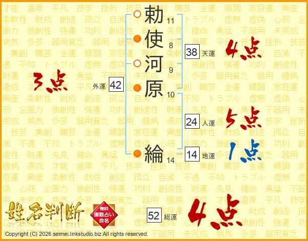 勅(11画)使(8画)河(9画)原(10画) 綸(14画)