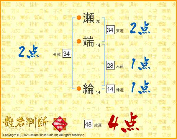 瀬端綸さんの総運は48画の4点!
