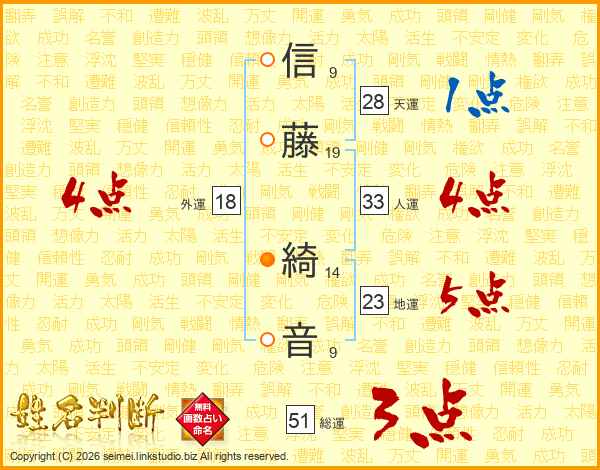 信(9画)藤(19画) 綺(14画)音(9画)