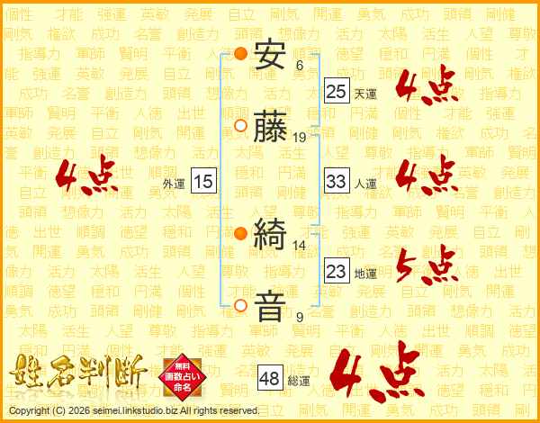 安(6画)藤(19画) 綺(14画)音(9画)