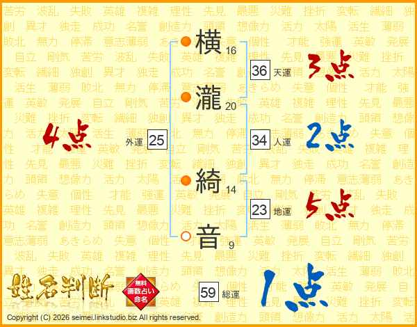 横(16画)瀧(20画) 綺(14画)音(9画)