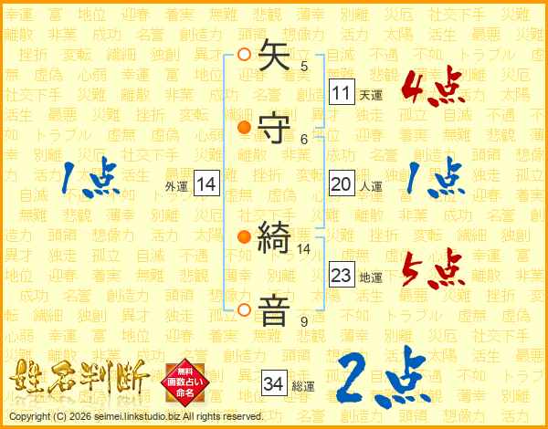 矢守綺音さんの総運は34画の2点!
