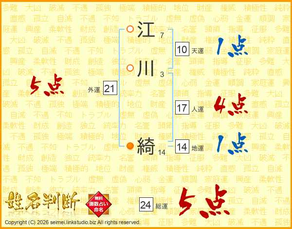 江(7画)川(3画) 綺(14画)