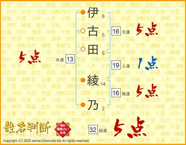 伊(6画)古(5画)田(5画) 綾(14画)乃(2画)