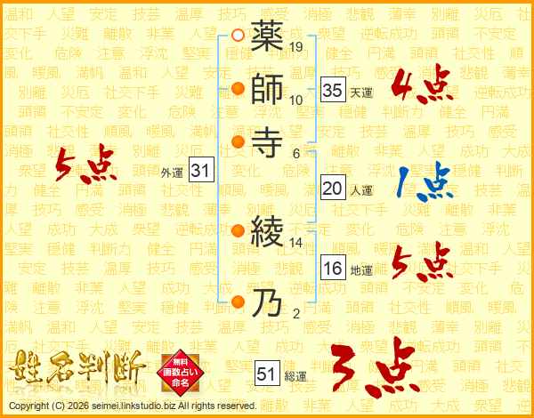 薬師寺綾乃さんの外運は31画の5点!