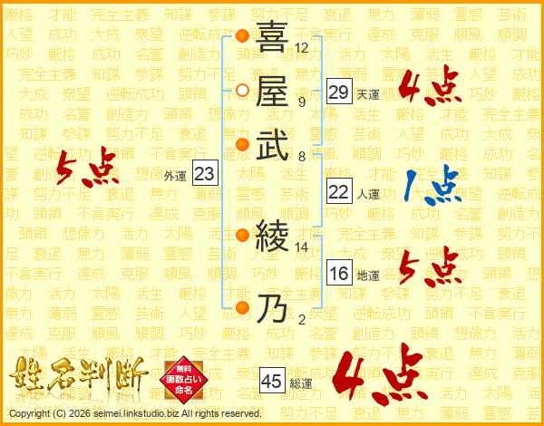 喜(12画)屋(9画)武(8画) 綾(14画)乃(2画)