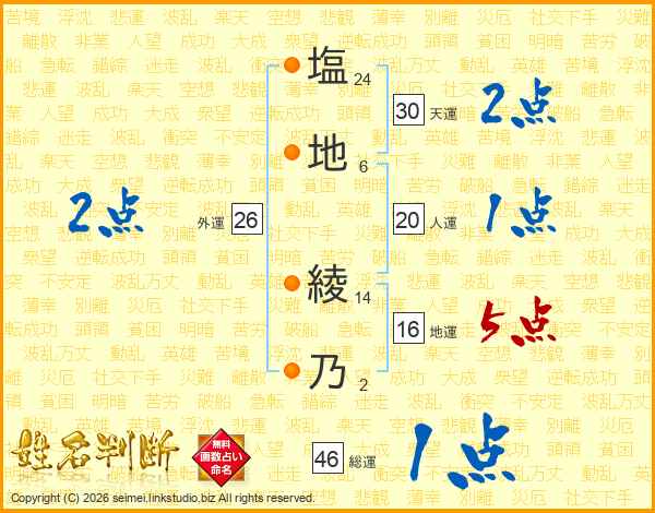 塩(24画)地(6画) 綾(14画)乃(2画)