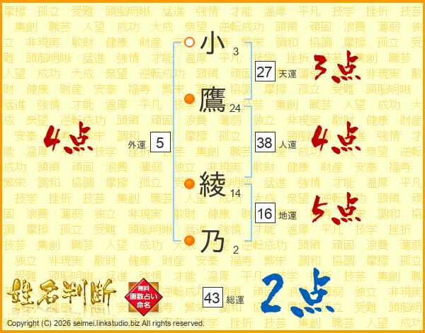 小(3画)鷹(24画) 綾(14画)乃(2画)