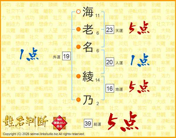 海(11画)老(6画)名(6画) 綾(14画)乃(2画)
