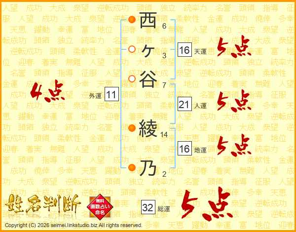 西ヶ谷綾乃さんの総運は32画の5点!
