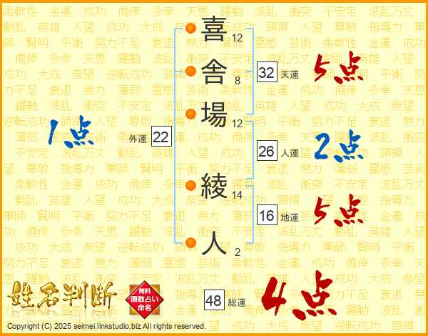 喜(12画)舎(8画)場(12画) 綾(14画)人(2画)