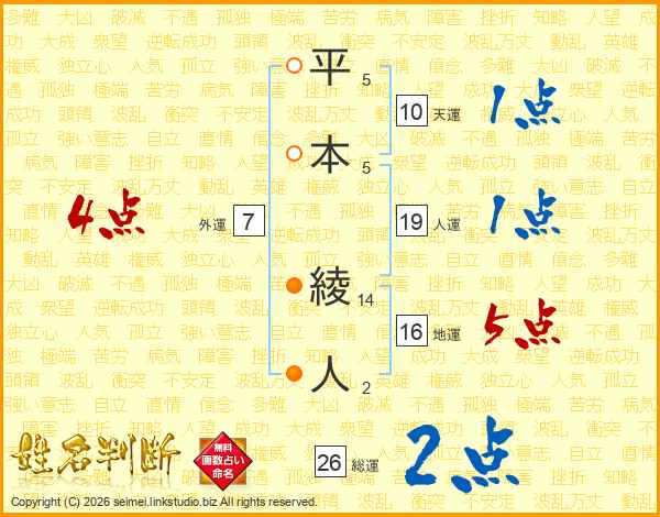 平本綾人さんの総運は26画の2点!