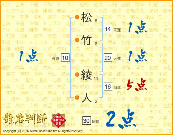 生活面を象徴する運勢です。外部から受ける影響力を表し、結婚運、家庭運や職場、環境への順応性を表します。総運から人運を引いた画数。姓や名が1文字の場合を除く。