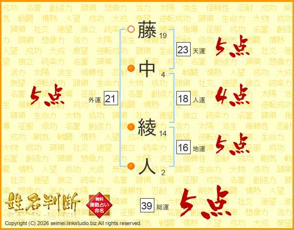 藤中綾人さんの総運は39画の5点!