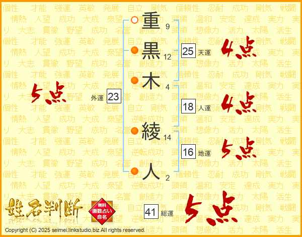 重(9画)黒(12画)木(4画) 綾(14画)人(2画)