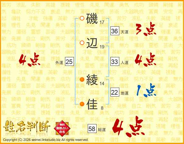 磯辺綾佳さんの総運は58画の4点!
