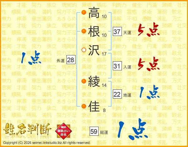 高(10画)根(10画)沢(17画) 綾(14画)佳(8画)