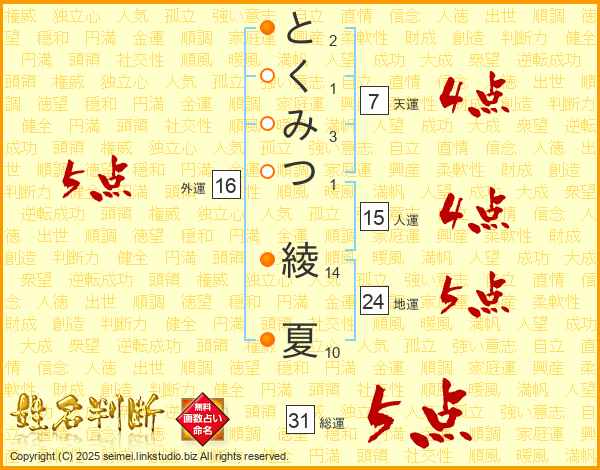 と(2画)く(1画)み(3画)つ(1画) 綾(14画)夏(10画)