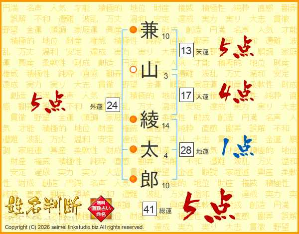 兼(10画)山(3画) 綾(14画)太(4画)郎(10画)