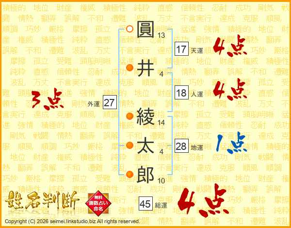 圓(13画)井(4画) 綾(14画)太(4画)郎(10画)