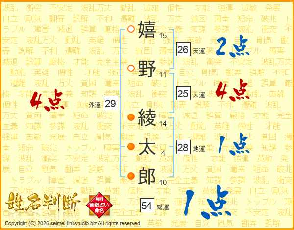 嬉(15画)野(11画) 綾(14画)太(4画)郎(10画)