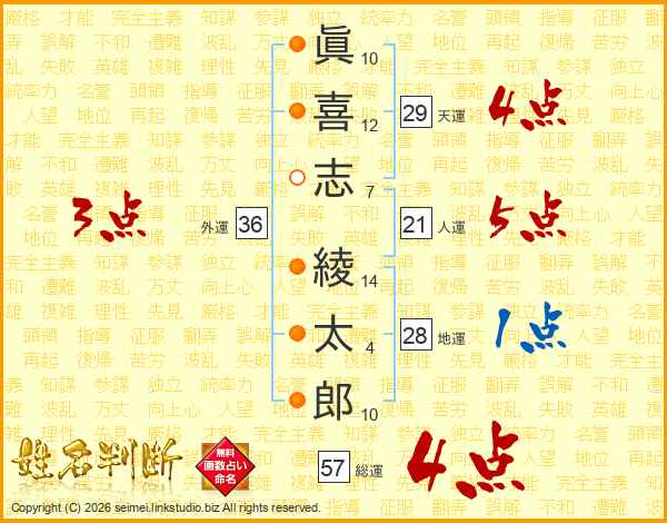 眞(10画)喜(12画)志(7画) 綾(14画)太(4画)郎(10画)