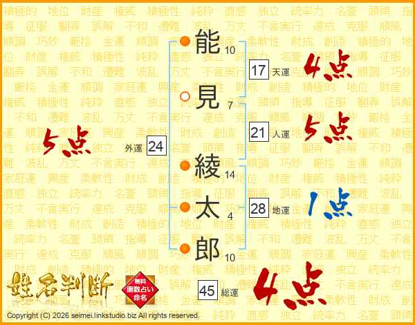 能見綾太郎さんの総運は45画の4点!