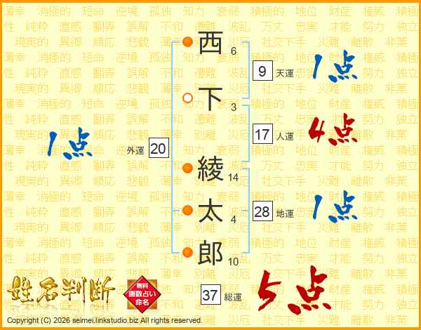 西下綾太郎さんの総運は37画の5点!