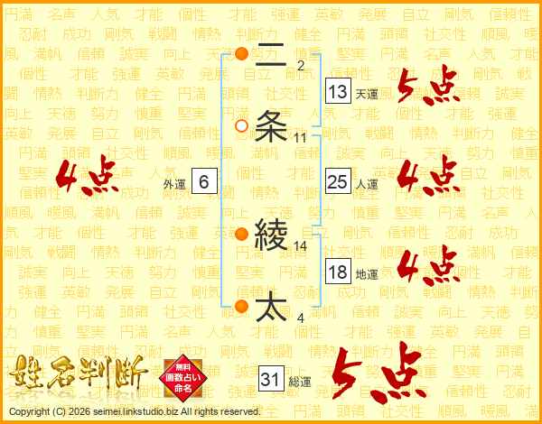 二条綾太さんの総運は31画の5点!