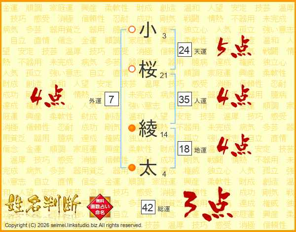 生活面を象徴する運勢です。外部から受ける影響力を表し、結婚運、家庭運や職場、環境への順応性を表します。総運から人運を引いた画数。姓や名が1文字の場合を除く。