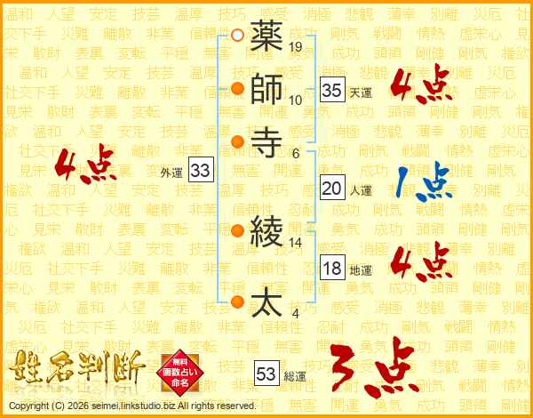 薬(19画)師(10画)寺(6画) 綾(14画)太(4画)
