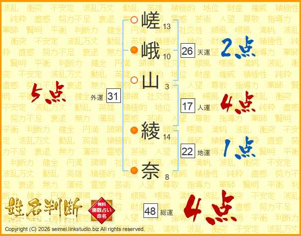 嵯(13画)峨(10画)山(3画) 綾(14画)奈(8画)