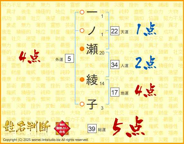 一(1画)ノ(1画)瀬(20画) 綾(14画)子(3画)