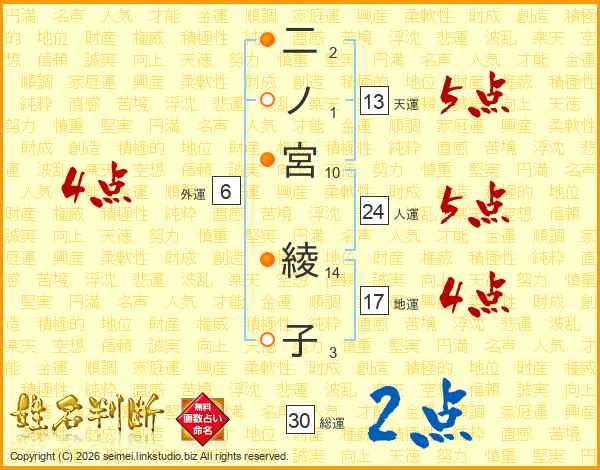 二ノ宮綾子さんの総運は30画の2点!