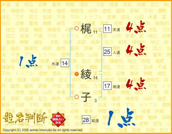 梶(11画) 綾(14画)子(3画)