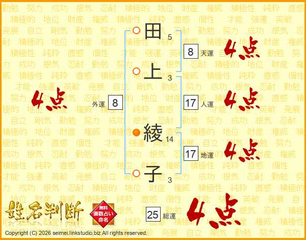 田(5画)上(3画) 綾(14画)子(3画)