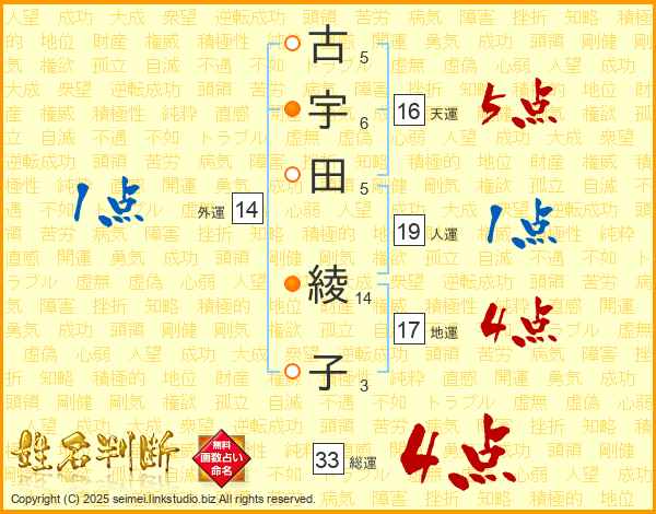 古(5画)宇(6画)田(5画) 綾(14画)子(3画)