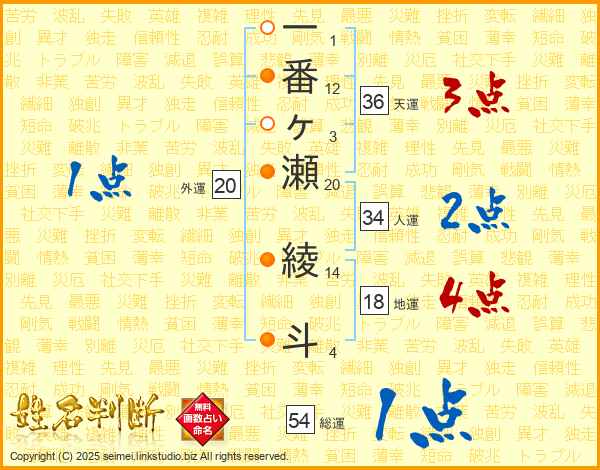 一番ヶ瀬綾斗さんの総運は54画の1点!