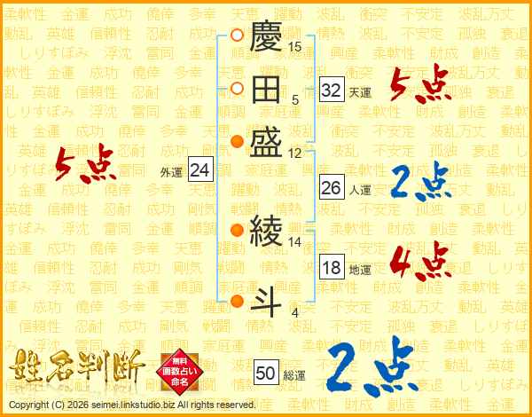 慶(15画)田(5画)盛(12画) 綾(14画)斗(4画)