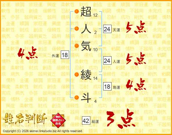 超(12画)人(2画)気(10画) 綾(14画)斗(4画)