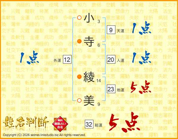 生活面を象徴する運勢です。外部から受ける影響力を表し、結婚運、家庭運や職場、環境への順応性を表します。総運から人運を引いた画数。姓や名が1文字の場合を除く。
