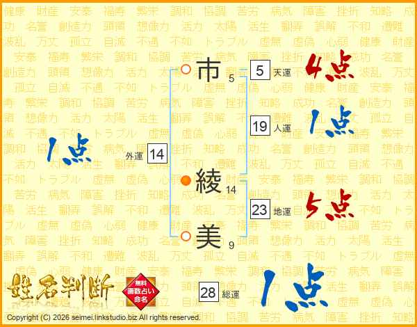 市(5画) 綾(14画)美(9画)