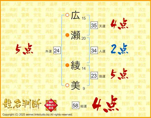 広(15画)瀬(20画) 綾(14画)美(9画)