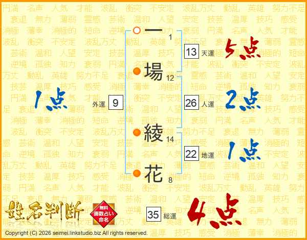生活面を象徴する運勢です。外部から受ける影響力を表し、結婚運、家庭運や職場、環境への順応性を表します。総運から人運を引いた画数。姓や名が1文字の場合を除く。