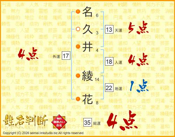 名(6画)久(3画)井(4画) 綾(14画)花(8画)