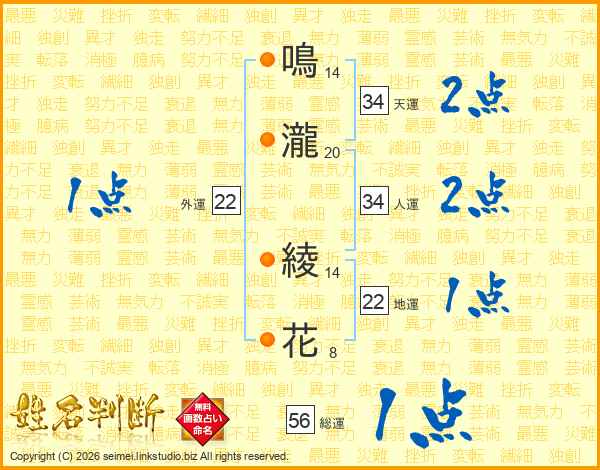 鳴(14画)瀧(20画) 綾(14画)花(8画)