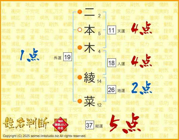 二(2画)本(5画)木(4画) 綾(14画)菜(12画)
