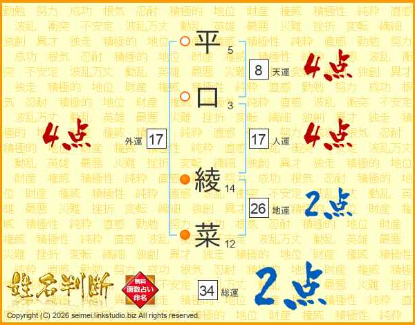 平(5画)口(3画) 綾(14画)菜(12画)