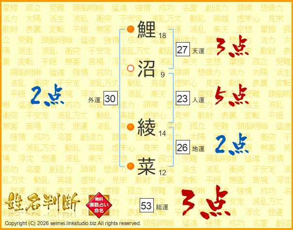 鯉沼綾菜さんの総運は53画の3点!